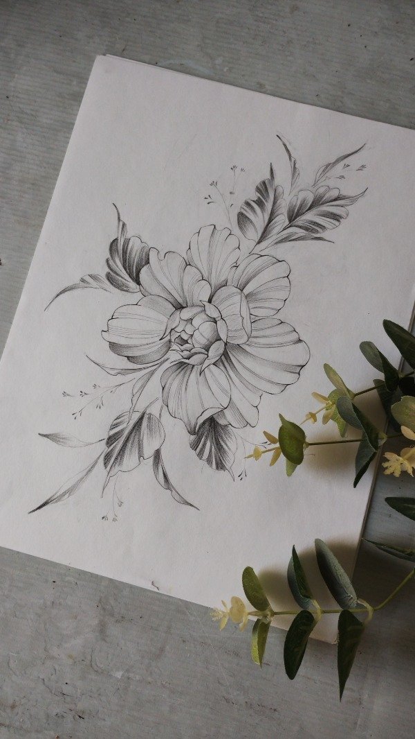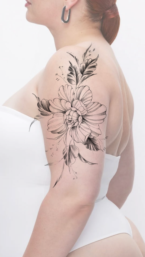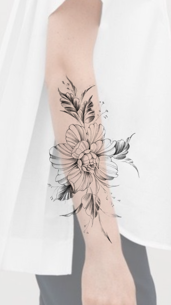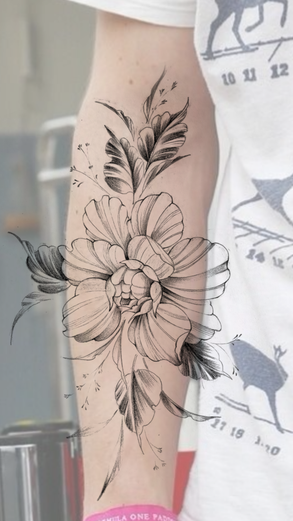 Flor de Peonias en negro. Diseño para realizar en linea fina con un sombreado sutil sobre la flor y en contraste con las hojas más oscuras.