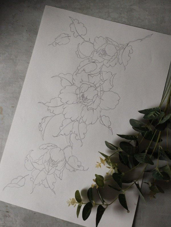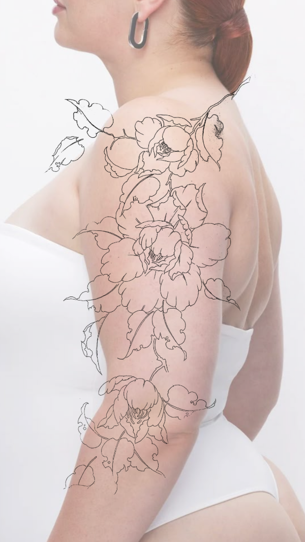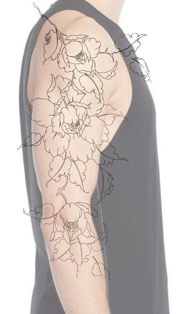 Diseño de manga 3/4 de Peonias para realizar en negro y sombreado.
